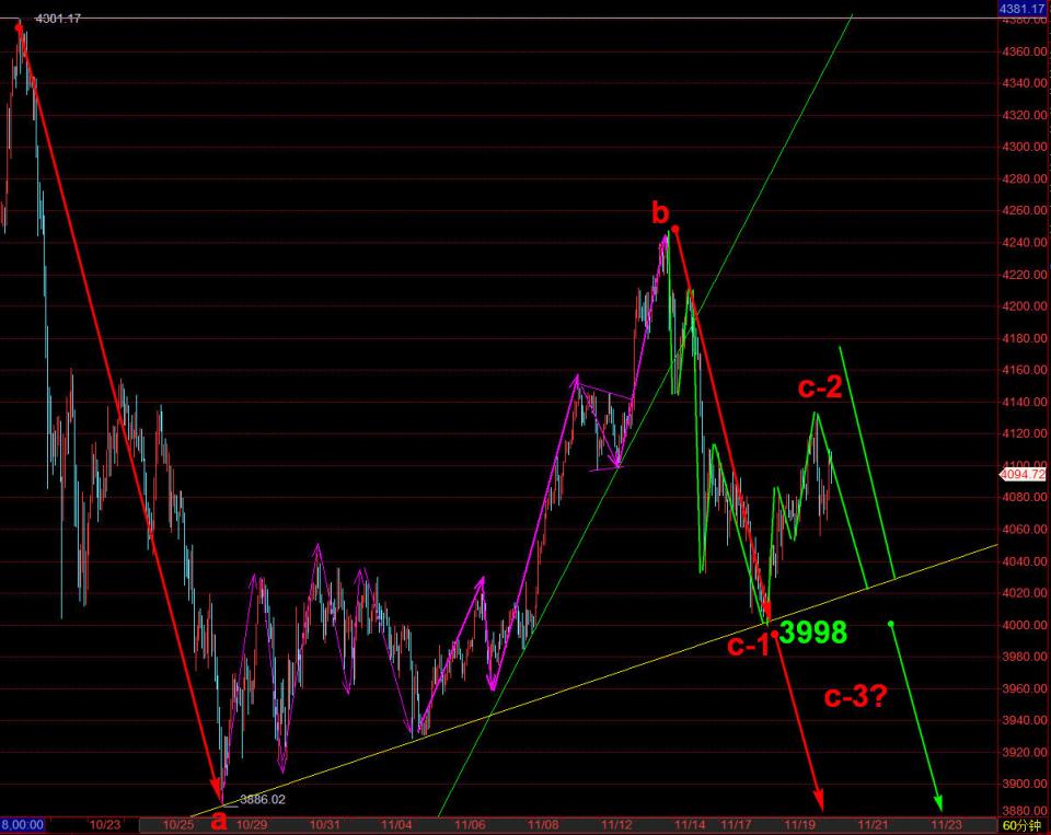 昨日黄金开盘4067.27美元,最高4132.81美元,最低4055.40美元,收盘4077.36美元,报收长上影线小阳线。上周四11月13日文章《【格物金融】黄金红b浪反弹尾声,注意再度酝酿下跌》我们将3886的上涨的红b浪当3-3-5的平台模式处理,得到的结论就是红b的c-5尾声,行情酝酿下跌,结果4245一线展开了下跌,之后的几个交易日,黄金一路下跌,到本周二录得低点3398一线,跌了247美元。周二的时候我们提及3886-3928的连线抵抗,昨天文章《【格物金融】黄金4245下跌第一阶段完成,关注是否迈入新阶段》提及黄金4245-3998已经完成了第一轮下跌,关键问题就是能否迈入新阶段的问题。