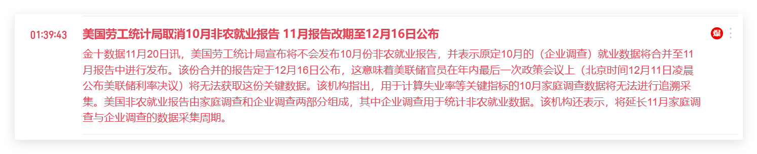 因为美国政府停摆,9月份和10月份的非农就业数据,没有能够正常公布。今天我看了一下消息,10月份的非农就业数据将和11月份合并在12月份公布,我们也需要重点关注一下今天的非农就业数据。