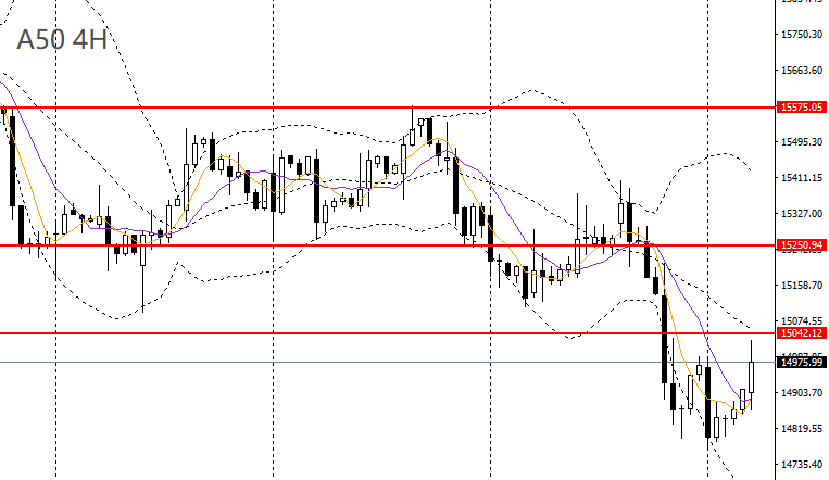 A50收锤子阴线,刺破14800一线支撑,但最终守稳上方,可继续关注15000关口压力,如继续承压于下方,短线可择机做空。