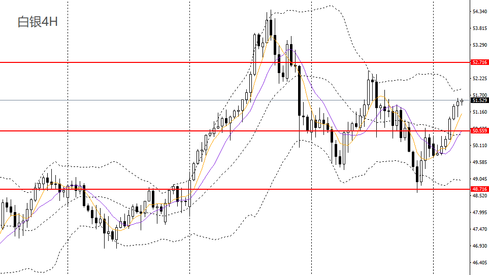 白银收长阳柱,日线RSI站上50,4小时重新升破50.50一线阻力,如于51一线企稳可进多,后市有望上探52。