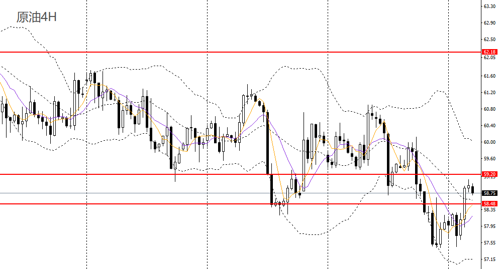 美原油昨日探底回升,持平前低,仍徘徊于日线布林下轨附近,4小时空头动能放缓,低位谨慎做空,如于59附近承压可进空。