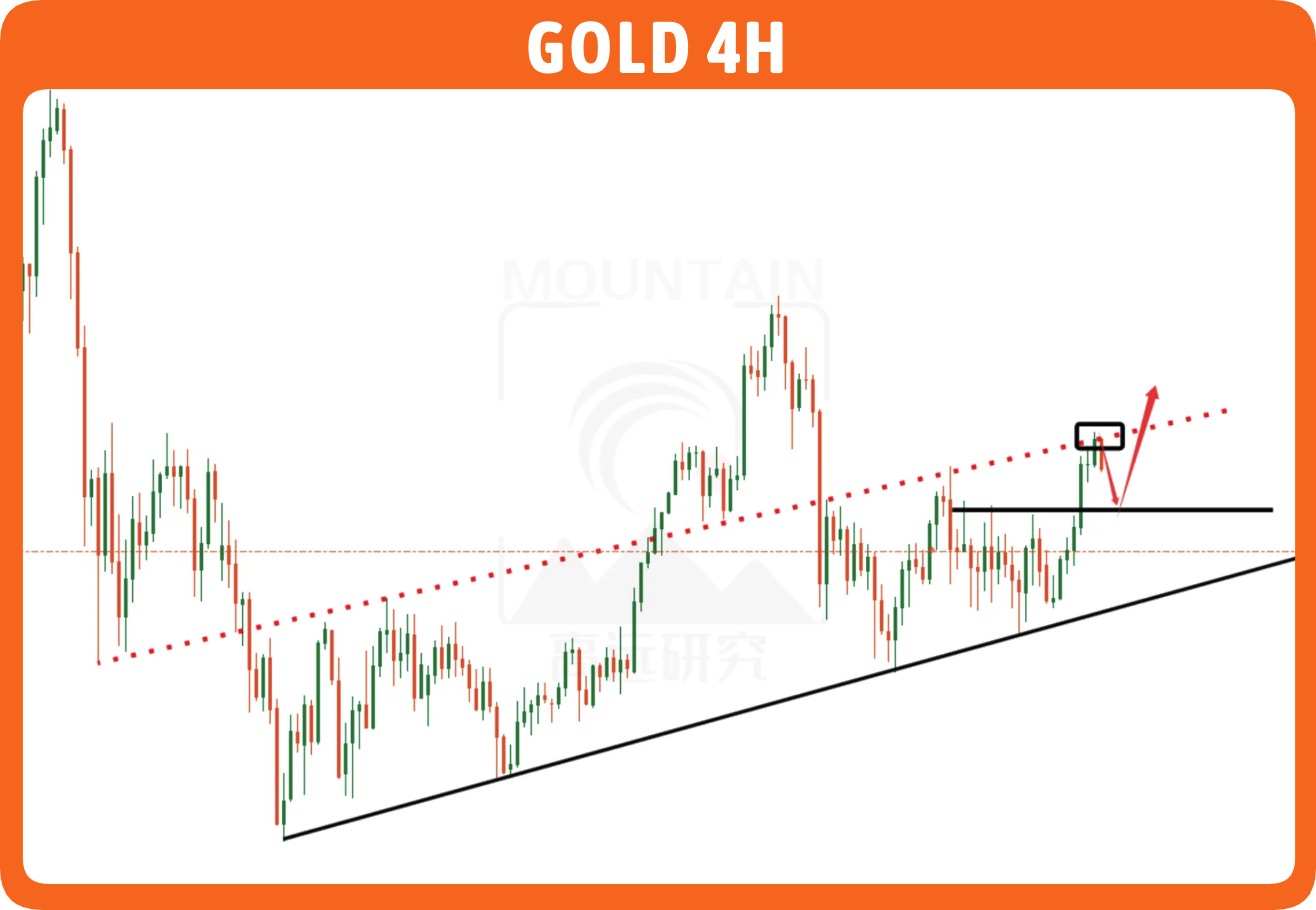 不过话说回来,即便是无效拉升,它仍然能确定一些信息,黄金已经被横盘破位,就像是之前4050被突破一样,你先别管后续是怎么表现的,它就是个不折不扣的看涨信息,你再去看跌其实就有点强行了,即便我也清楚,图中趋势线末端给的价格刚好是4160左右,而我对4160也很熟悉,不就是4380大跌后的反弹高点平台嘛,确实,要玩超短线是有点意思的。