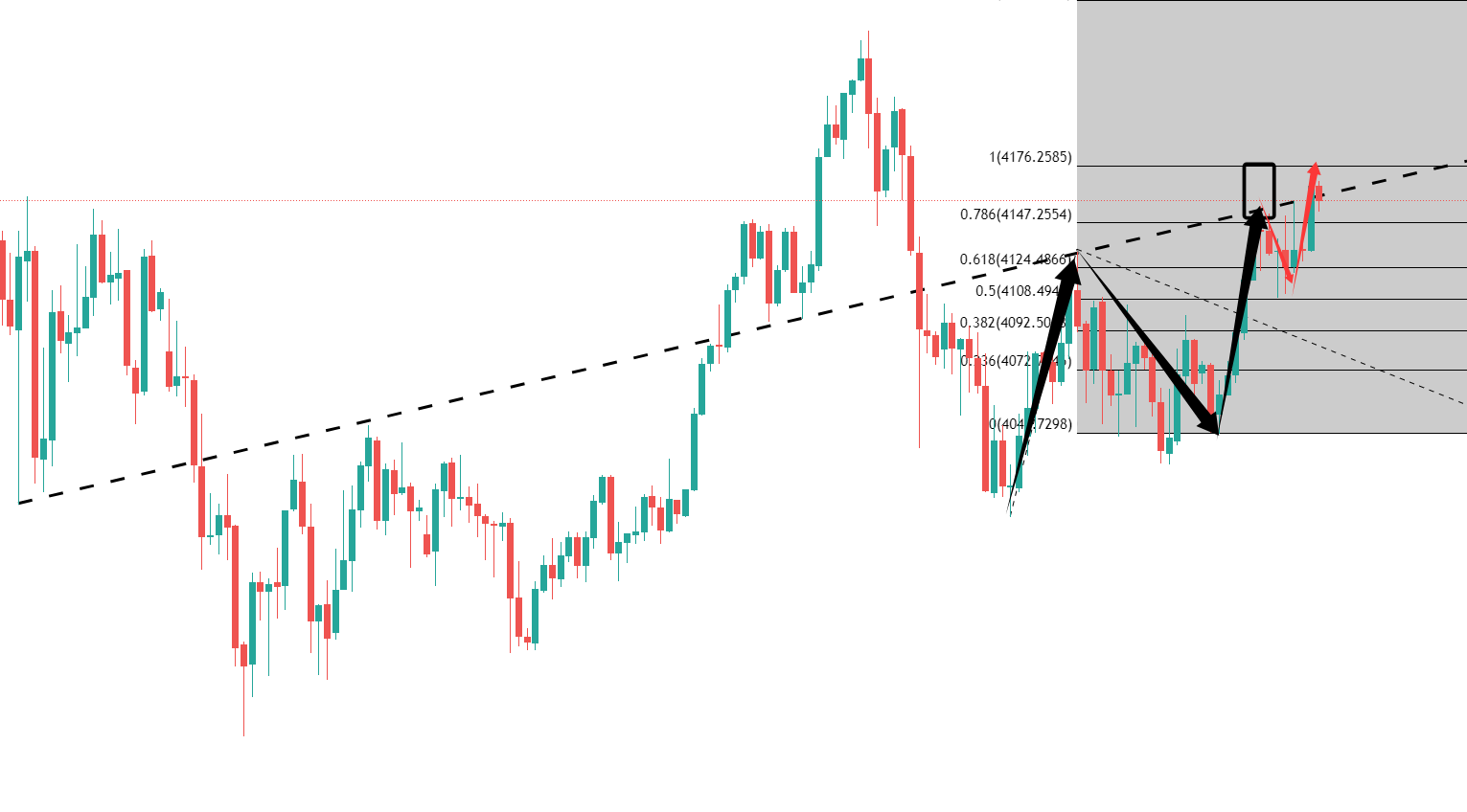 如果,昨天它能直接上涨到位的话更好,这样你说它可能是压力我还信,图中N字上涨的末端正是4176,可是昨晚它在60附近走了回落震荡,并且K线痕迹特别明显,具备一定周期,然后早上接着向上突破,难道我还要去看本就应该是昨天的压力位4176吗?它可是高位二次冲高,又不是一轮行情,这破位的概率当然大了,所以这就是为什么我懒得再去观察4176的原因。