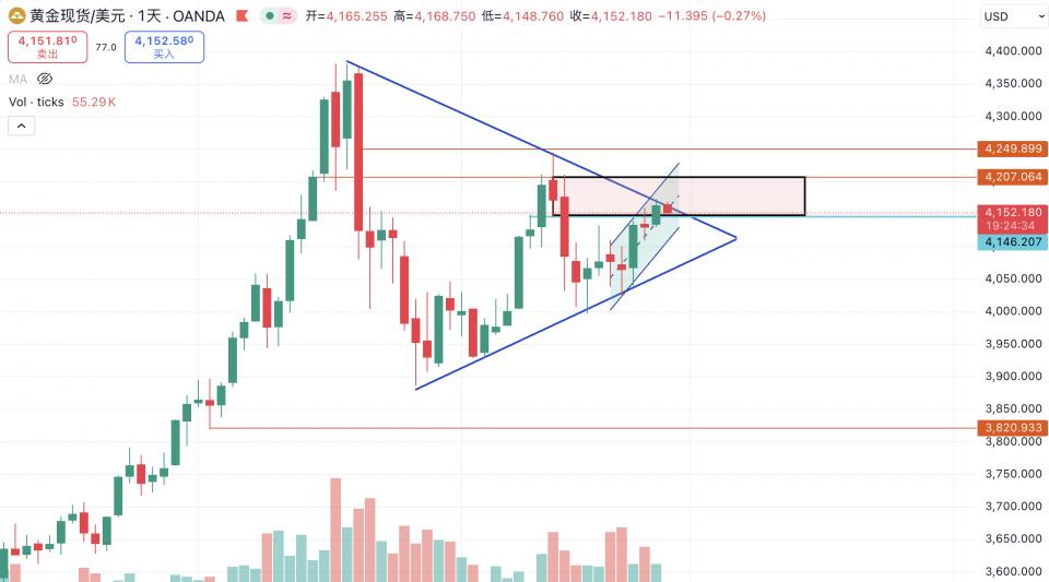 黄金价格自上周五触及趋势线底部回升,至昨日(26日)触及上方下行趋势线后停滞,今天(27日)早盘价格在短暂刺破该趋势线压力(4168)后再次下调,1小时级别的支撑在4138,考虑到今晚开始将进入到感恩节假期,行情可能会趋于清淡。