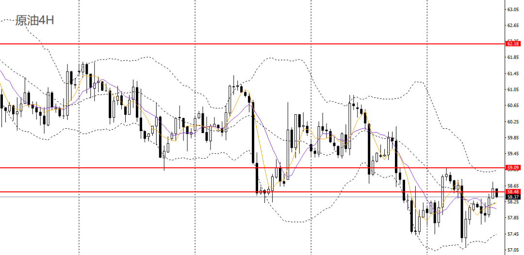 美原油周三小幅反弹,徘徊于5日均线附近,日线RSI仍位于50下方,4小时触及58.5-59压力带,如继续承压于下方,短线可维持空头思路。