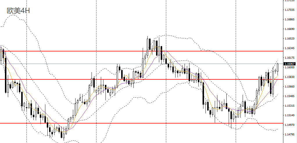欧美昨日再度收涨,日线RSI升破50,4小时触及1.16关口,短线趋势强劲,如于1.1580附近企稳可继续进多,后市有望挑战1.1630。