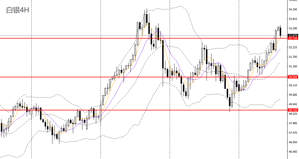 白银昨日强势上攻,日线RSI上扬,4小时上破52.40一线阻力,上行空间打开,如于52.70附近企稳可进多,后市有望挑战53.50。