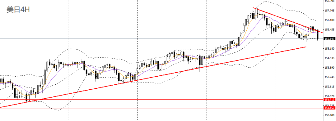 美日昨日收阳,仍承压于5日均线,日线RSI回落,4小时处于下行趋势线之下,整体走势仍偏弱,空单可继续持有,后市预计将下探155-155.20。