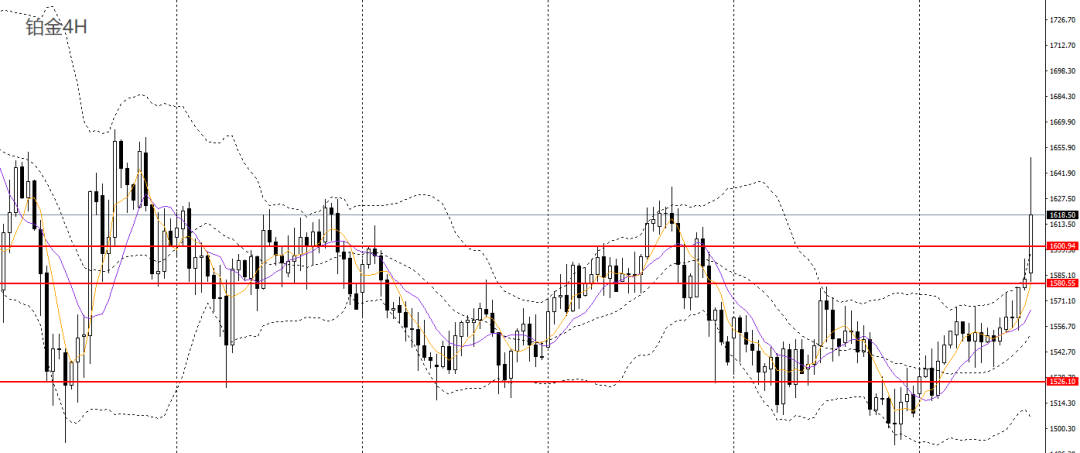 铂金收长阳线,刺破日线布林上轨,日线RSI站上50,4小时上破1580-1600阻力带,且刺破1630一线压力,短线趋势转多,1600上方可延续低多思路,后市预计将再度挑战1650-1660。