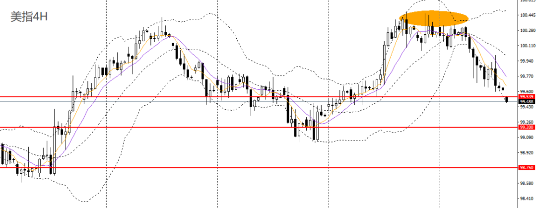 美元指数持续阴跌,今日亚盘跳空走低,回踩上行趋势线,4小时刺破99.50一线支撑,如进一步下破,可继续看空至99-99.20。