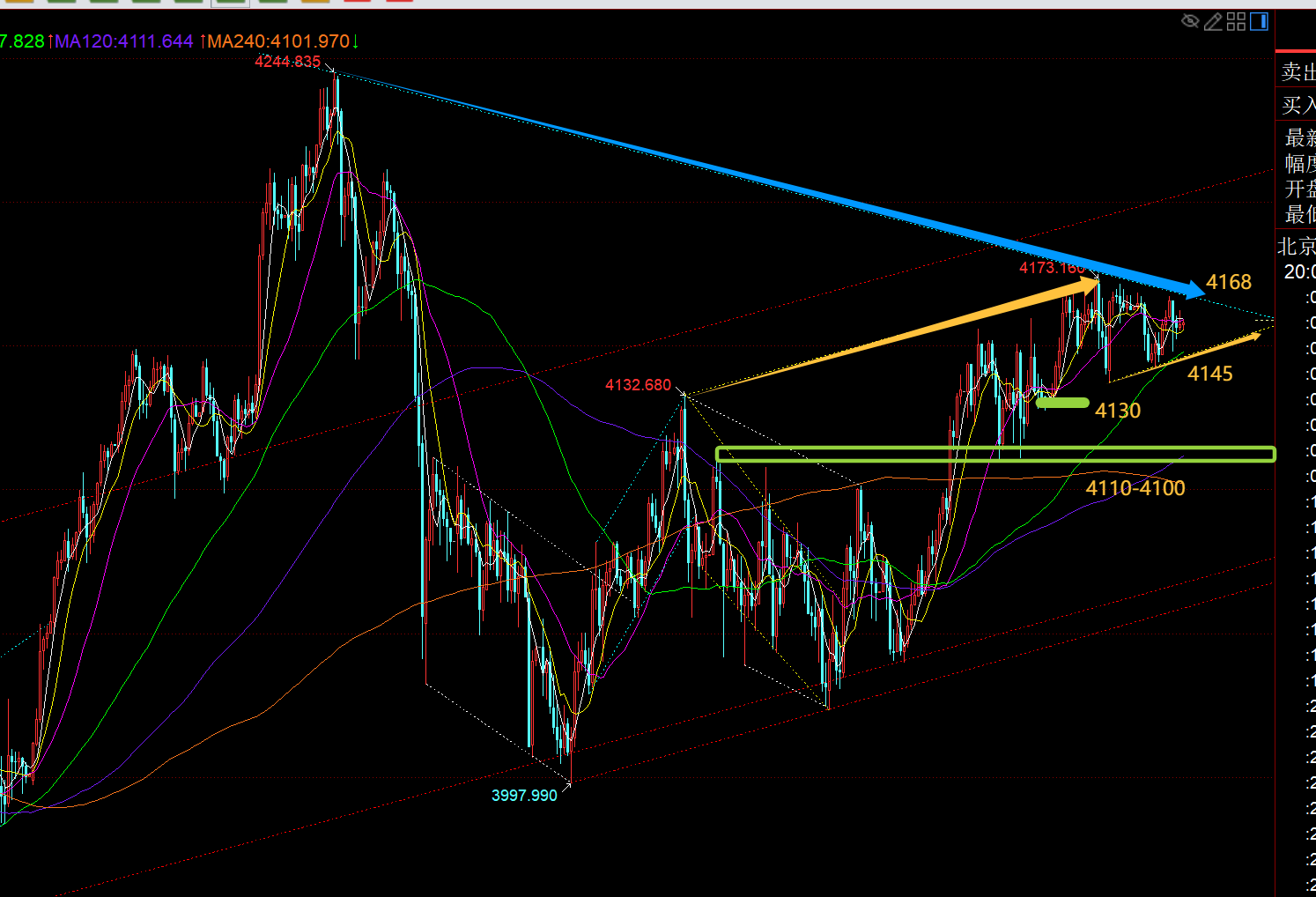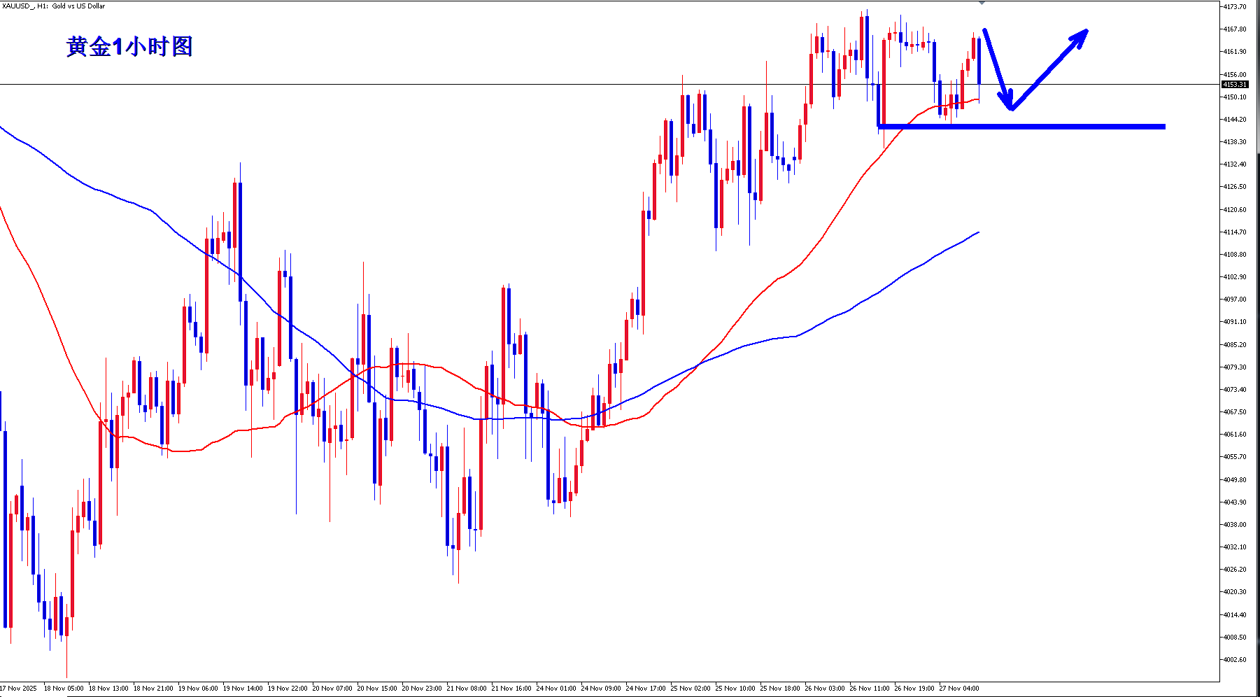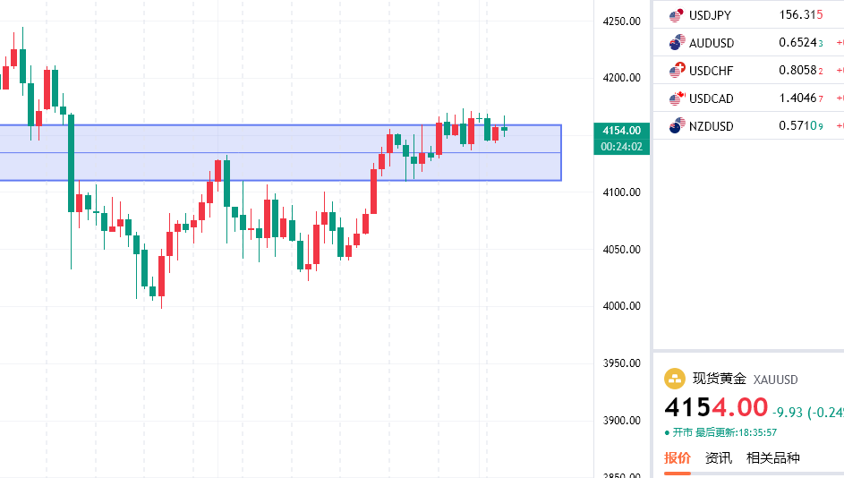 从之后的走势看,昨日周四亚盘开盘后,黄金震荡回落,跌至4142美元企稳,欧盘开盘后,金价反弹4167美元遇阻,美盘开盘后,由于感恩节的缘故,金价基本保持4150到4160美元区间横盘震荡,市场交易十分平淡。