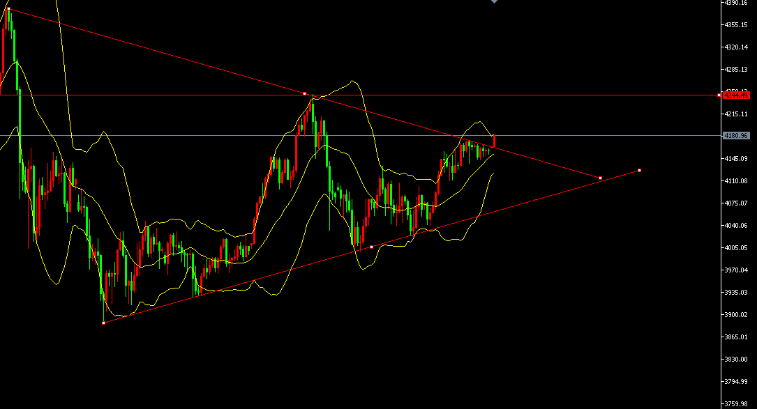 黄金日线连续十字K线窄幅整理,昨日围绕下行趋势线附近来回拉锯,小区间4170-4130来回拉扯后,今日开盘突破了趋势线的阻力压制,没能弱势转换回落,拖到今日周线月线收官之作,月线再次摸高上影线,此前上探后承压回落,但持续性不强,到了尾盘收盘二次摸高,今日仍重点留意月线和周线能否完成探高收低回落,决定月线级别的调整空间。