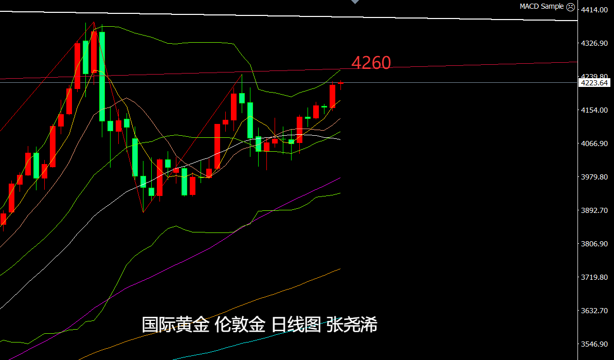 日图;金价自筑底布林带中轨支撑盘整后,多头反弹拉升走强,目前30日等众多均线已转为支撑,布林带也开口向上延伸,多头前景加大,附图指标也维持看涨信号发展,短期方向将仍以看涨反弹为主,下方关注5日均线支撑附近仍以看涨为主,继续等待上探4260美元或4380美元目标。