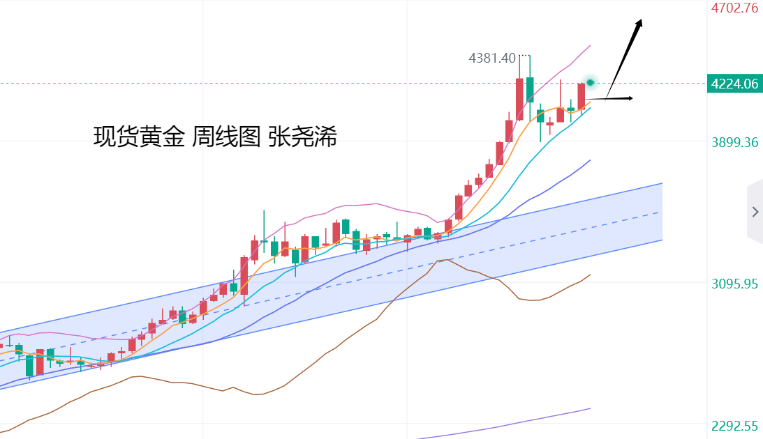 黄金市场上周:国际黄金强势反弹收阳,收复自历史高点而下的大部分跌幅,并稳健运行在10周均线上方,且保持向上看涨预期,基本面利空暂以出尽,降息前景则依然高涨,故此,后市仍以看涨走强为主。