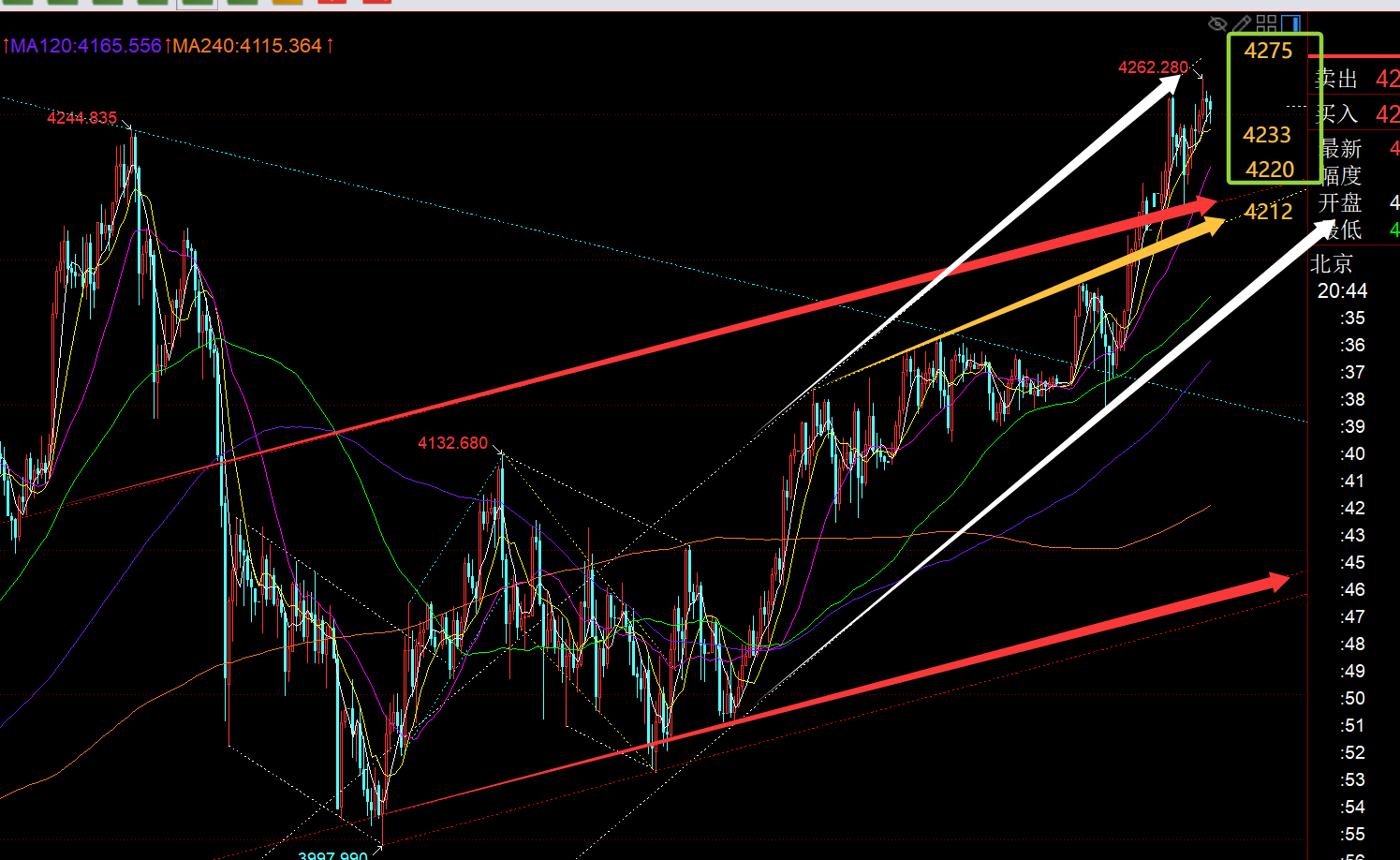 第一:4小时,随机指标向下运行,偏空信号;MACD双线钝化状态!形态上暂时阴跌向下,偏空信号;下面的支撑位置暂时在4195上下的位置【昨日也卡这个支撑低多,但是并未给到这个为止!】