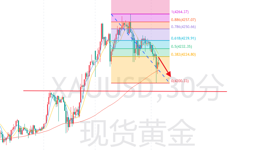 早盘,黄金小幅整理后开始下跌,在跌破昨晚低点4220支撑后加速下行,最低跌至4200附近后反弹整理。金价跌破昨日低点后,空头应该还会有延续,短期压力在4220附近,昨晚低点,短期的顶底转换位,但这个位置,止损不太好带,所以,做空的位置,我们放至4225附近,回撤反抽的382压力位,以早盘高点作为止损位进行防守即可,下方支撑关注日线5日均线4195,此位也是4152-4265上升回撤的618支撑,日内黄金,首次触及此支撑位附近可以低多,强支撑4172,也是二次做多的位置。