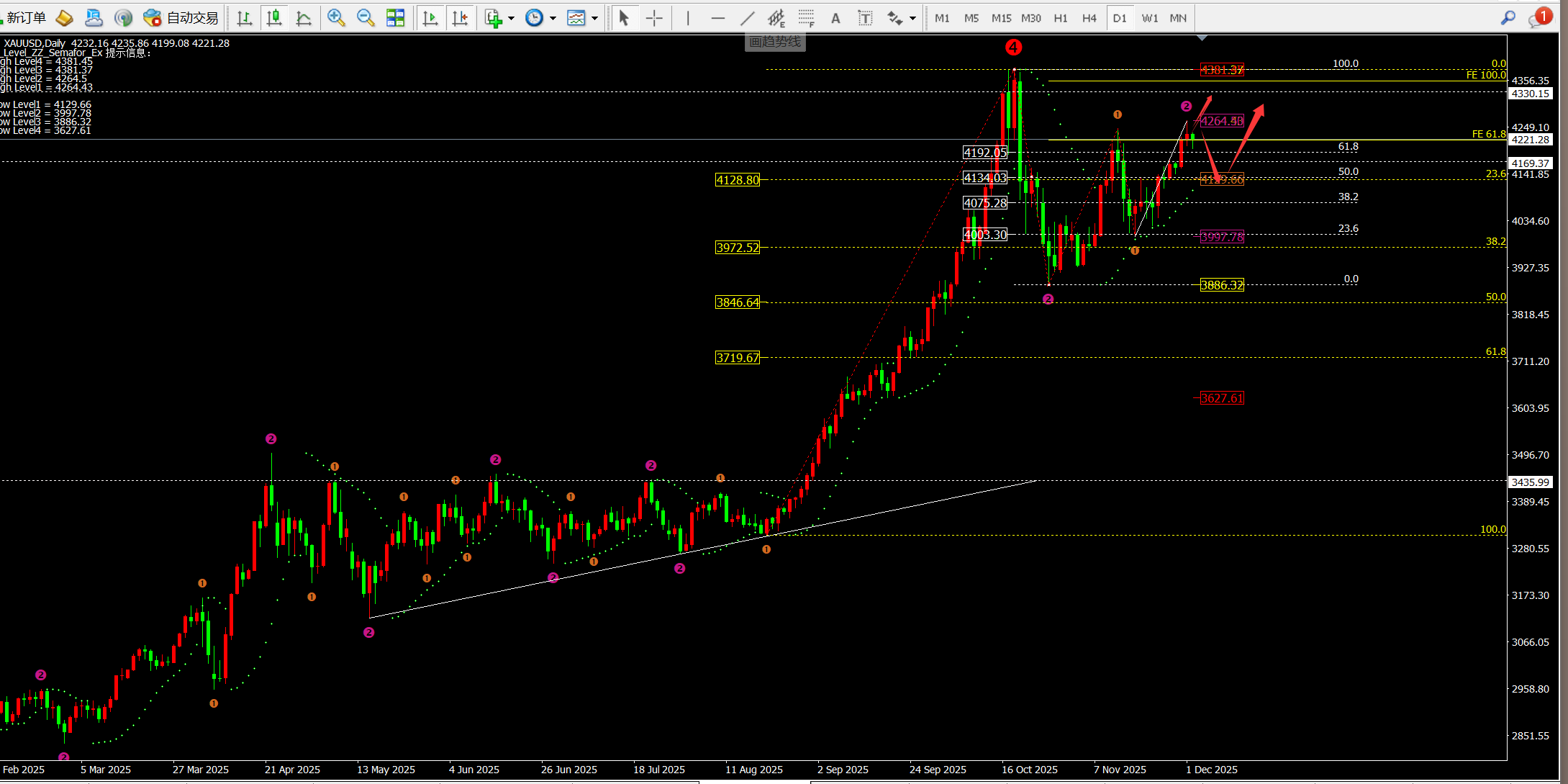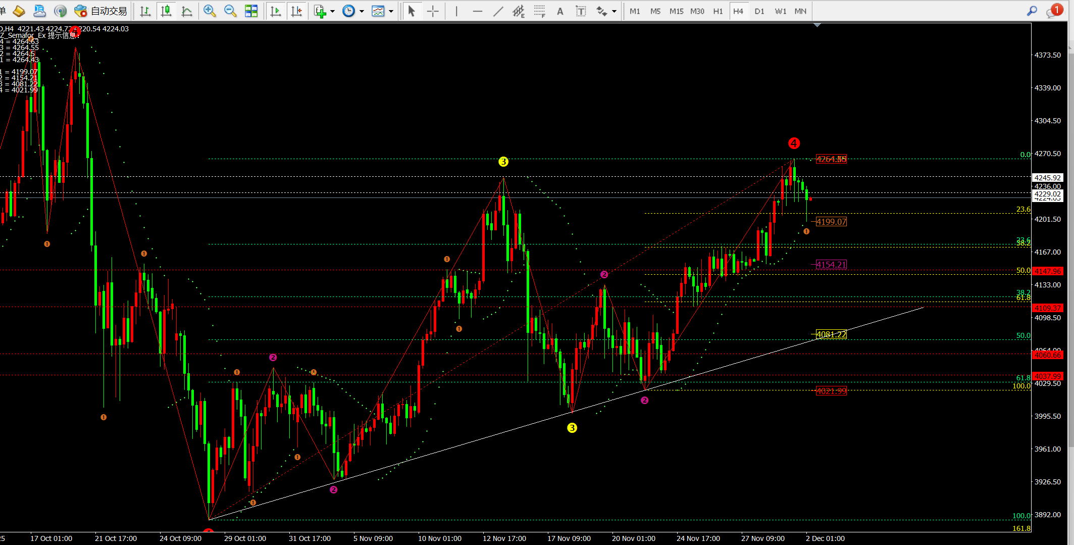 日线短期看是4198-4262的大区间,只有跌破均线MA5才会到4148上方,而根据上周走势价格可能到达4160-4170附近。