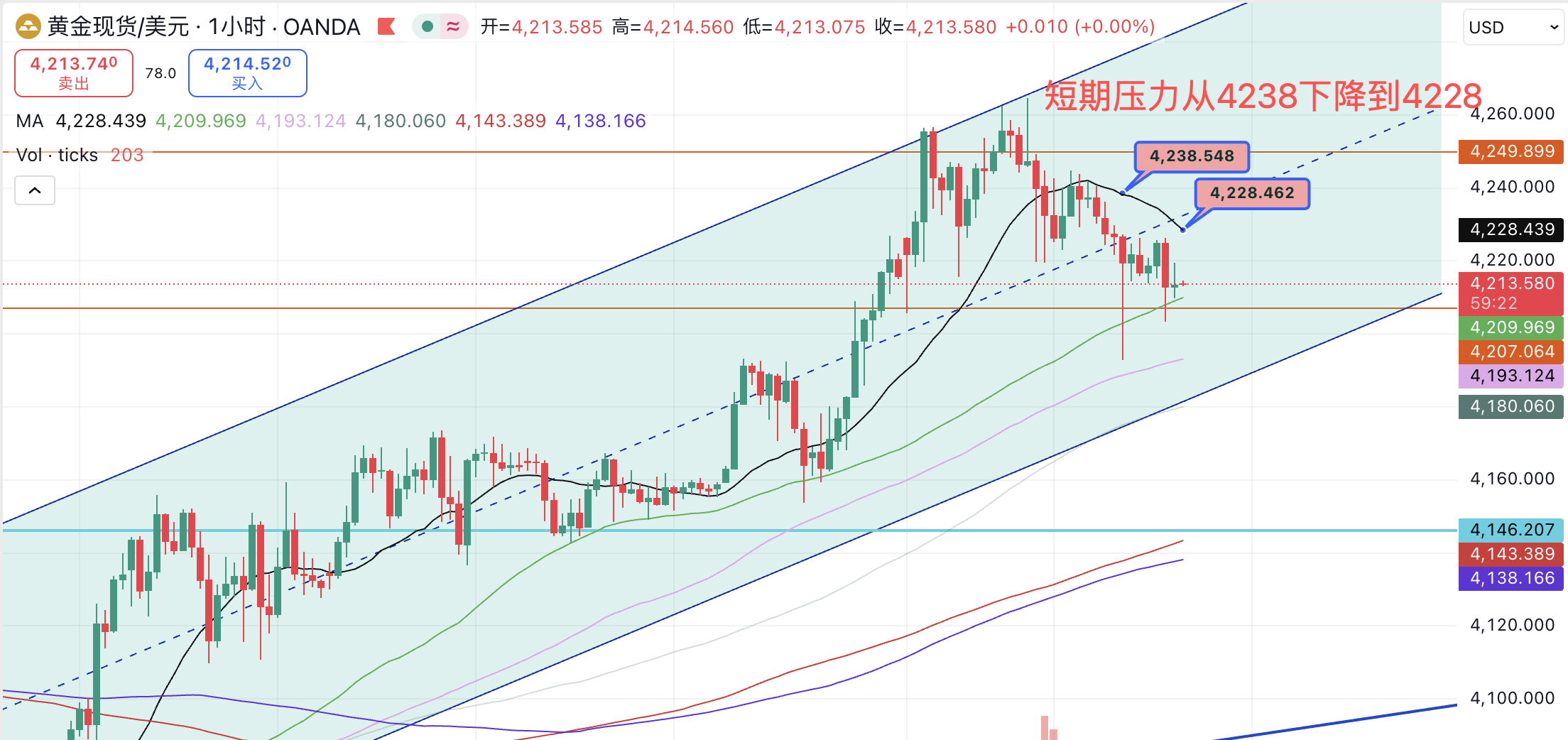 欧市盘前,黄金在短期市场倾向下跌,1小时压力位从早上的4238下降到4228。