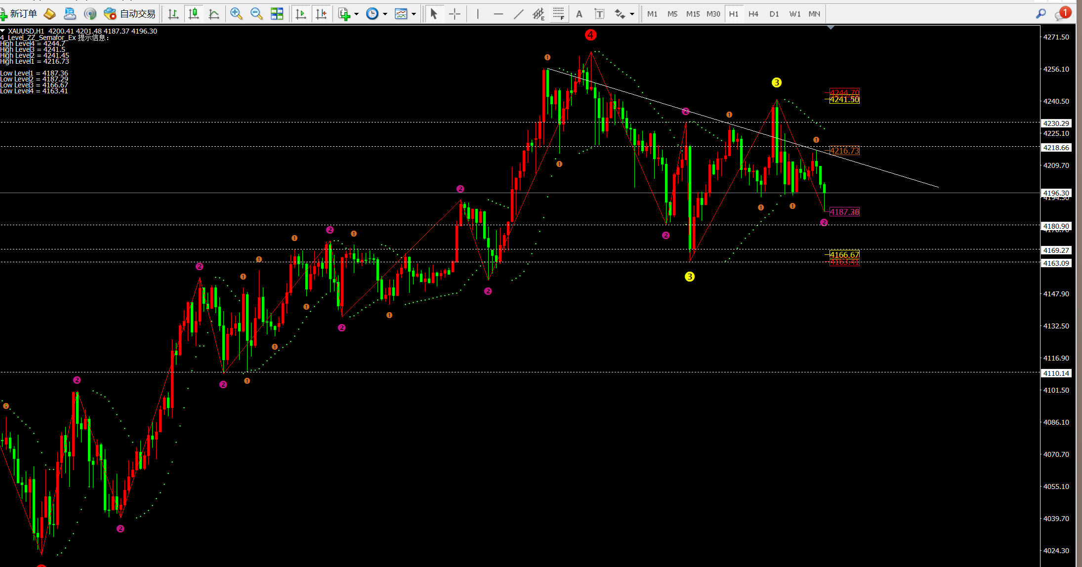 总结:根据以上思路判断日内将有两波空单:一个是4216下方参与;一个是4227-29附近;而多单目前位于4270-75一线。同时4260作为分界点存在。