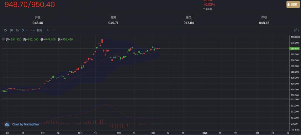 从日线图来看,融通金仍处于大级别上涨通道中,整体走势强势。价格在10月加速拉升后进入横盘整理,近一段时间K线在布林带中轨上方运行,说明多头力量依旧占优,但行情进入了震荡消化阶段。