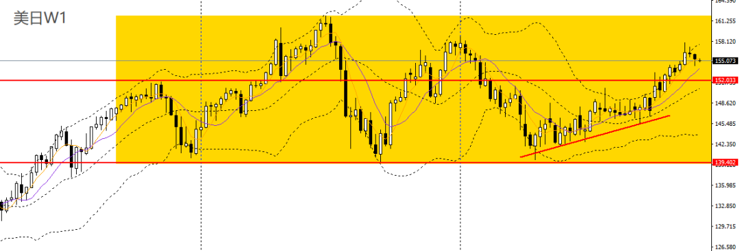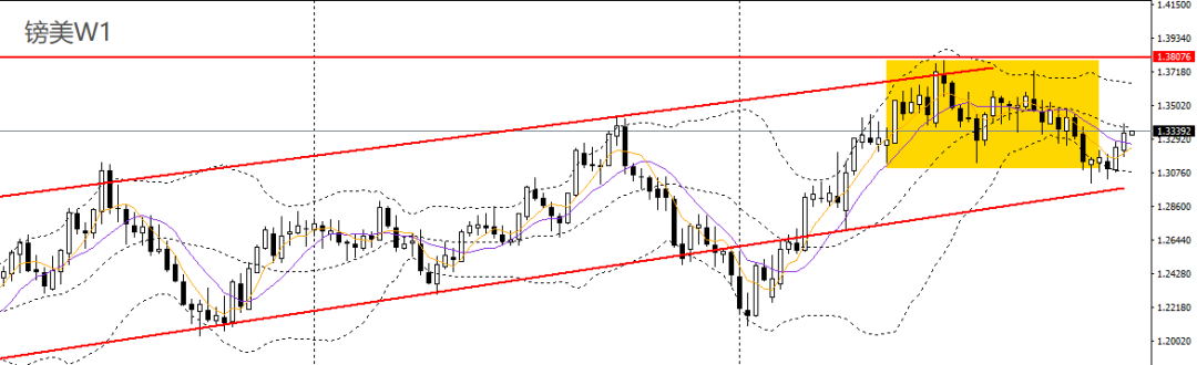 镑美上周继续收涨,RSI站上50,波段走势仍处于上行通道内。周五收倒锤阳线,下探5日均线,4小时守住1.33关口支撑,短线走势偏强,如继续维稳于上方,可延续低多思路,后市预计将再度上探1.3380-1.34。