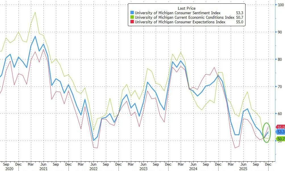 美国12月密歇根大学消费者信心初值指数录得53.3。