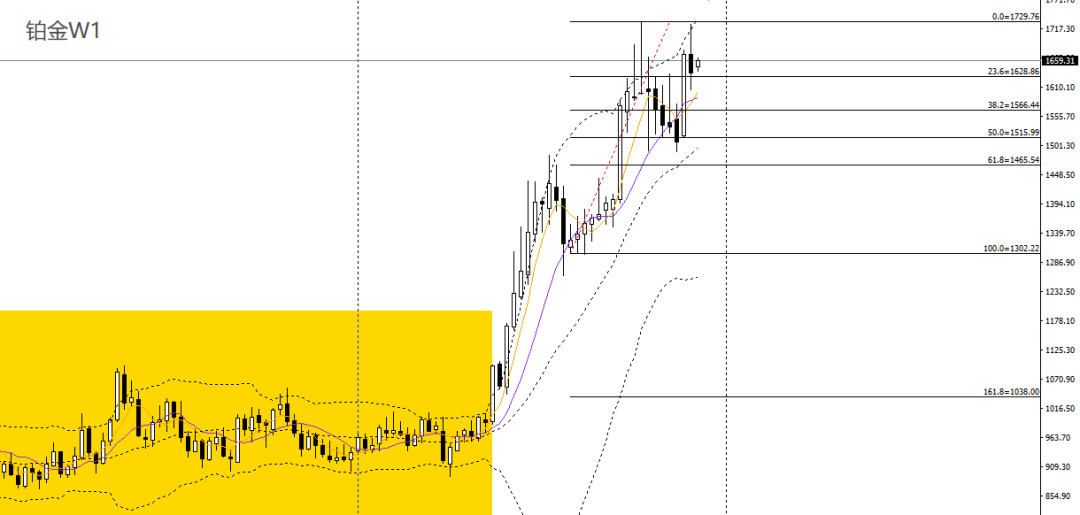 铂金上周逼近前高,RSI到达高位,波段仍处于震荡偏强格局。周五收倒锤阴线,日线RSI仍位于50上方,4小时波幅有限,如再度回踩1630附近企稳可进多。