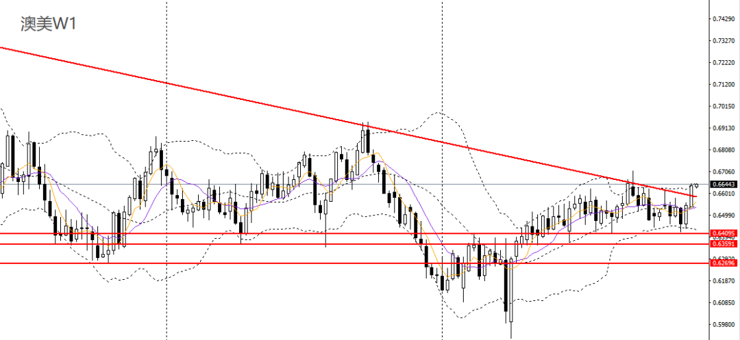 澳美上周强势拉升,升破下行趋势线,波段有望延续反弹。日线连续走高,站上布林上轨,日线RSI到达高位,4小时升破0.6620一线阻力,0.66上方可维持多头思路,后市仍可上看至0.6660,0.67。
