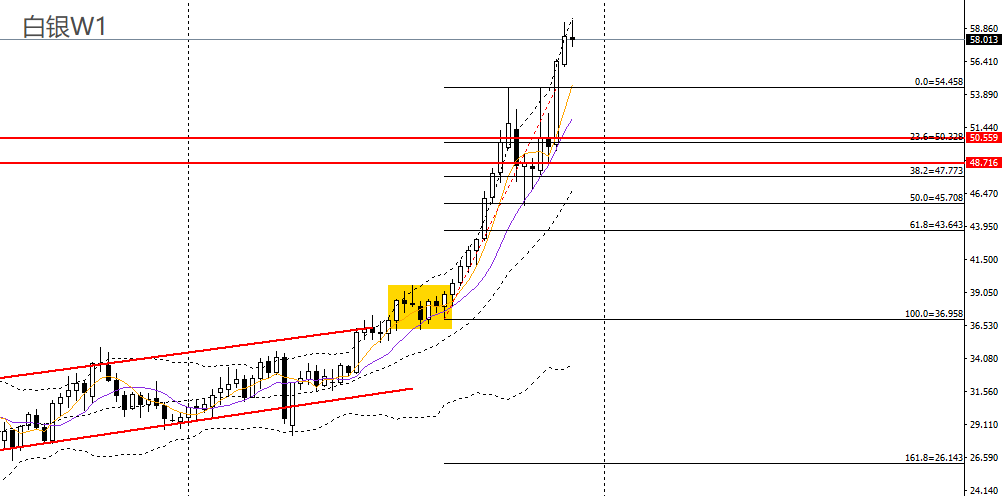 白银上周收流星阳线,徘徊于周线布林上轨附近,波段有望进一步升破前高。周五冲高回落,仍徘徊于5日均线附近,4小时处于56.60-59区间震荡走势,如升破前高,可继续看多至59.50。