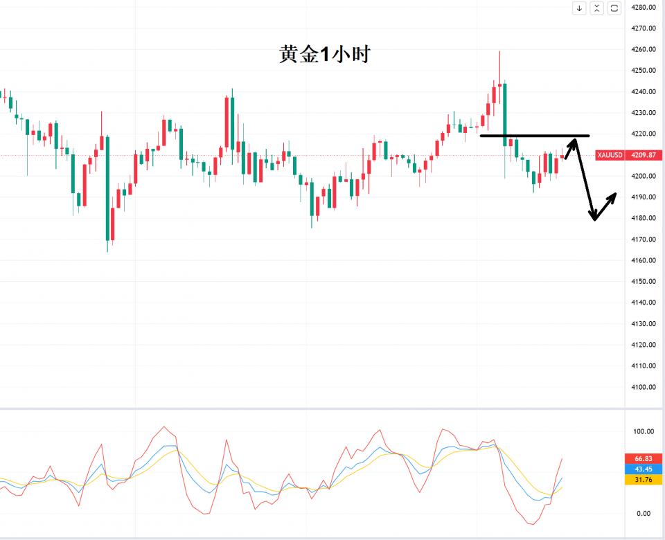 今天,黄金反弹后靠近4220-25美元短空,日线级别四天连收十字K,冲高回落上方4250-60美元抛盘压力较大,向下关注支撑在4185-4180美元,短期震荡看弱势调整,并非否认长期上涨。