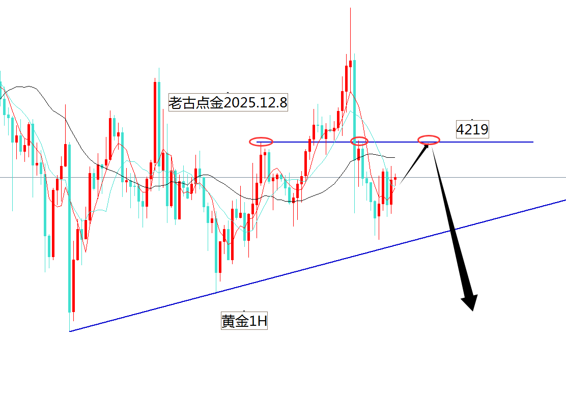第三,黄金小时线级别:今天亚欧盘目前来看,波动基本很小;隔夜冲高走跌弱势,今日则依托382分割阻力,也是靠近小时线中轨,和凌晨最后的压制位置4218-19下逢高先看跌为主,因为早间是先反弹的;走到现在,压制下来最低也只试探了4200,波动及其缓慢墨迹; 今晚,首先留意中轨,能压制的话,则基本日内高点就不会去突破,形成压制继续震荡下滑;反之,若连阳突破站上中轨,那么日内高点可能会上破下,届时留意4225-4233范围阻力,也是50和618分割处,压制仍继续震荡看跌,支撑4192-91,也是4163-4175趋势线支撑,只有什么时候有效跌破此处支撑,那么4260-4160相对高位的反复整理也就结束,会步入新的震荡区间,高低点都会下移,可能是4100-4200;