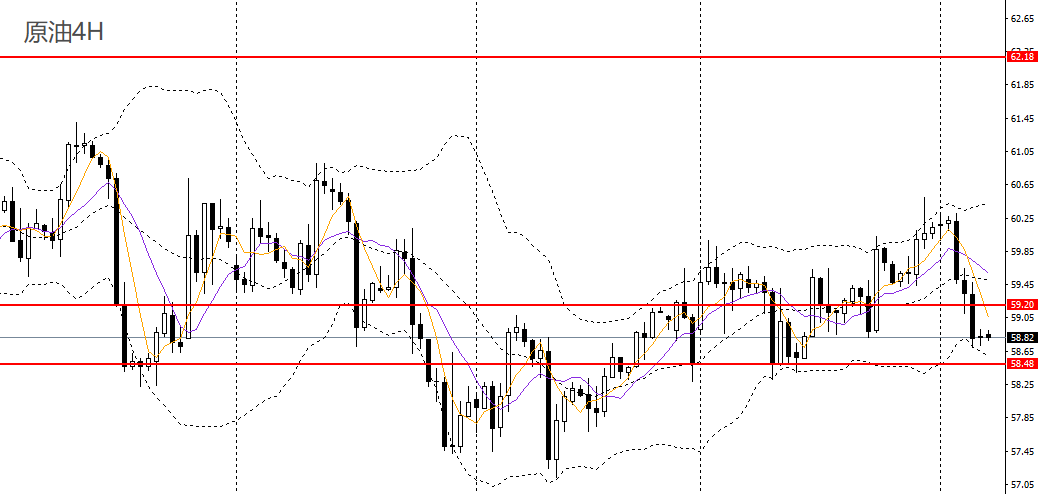 美原油昨日收看跌吞没阴柱,4小时未能成功上破60一线阻力,短线趋势转空,但整体方向仍不明朗,可保持观望。