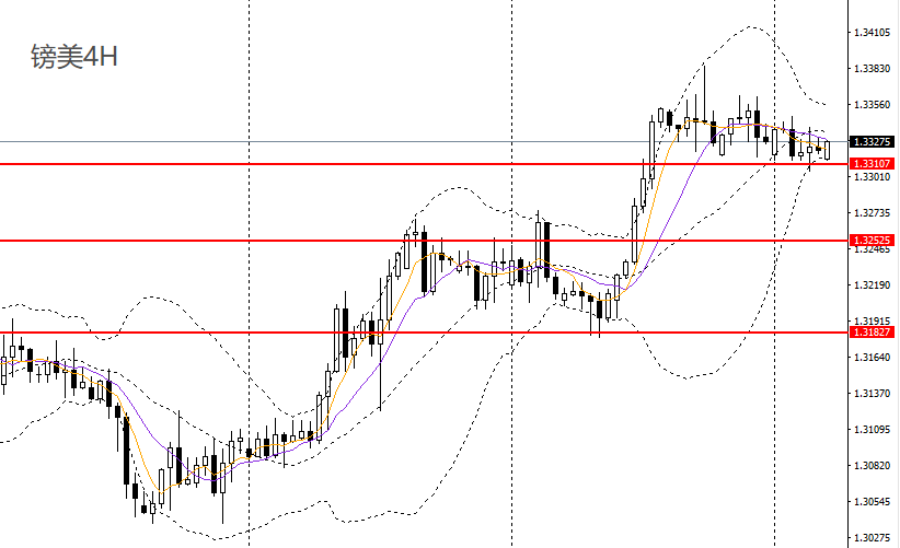 镑美昨日微幅震荡,4小时回踩1.33关口企稳,短线走势仍偏强,如继续维稳于上方,可延续低多思路,后市预计将再度上探1.3380-1.34。