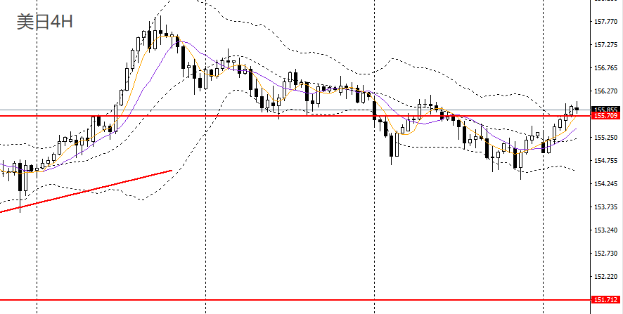 美日周一强势回升,上破10日均线,4小时触及156关口阻力,短线趋势转强,155.70附近企稳可进多,如彻底升破156,可看多至156.50-156.70。