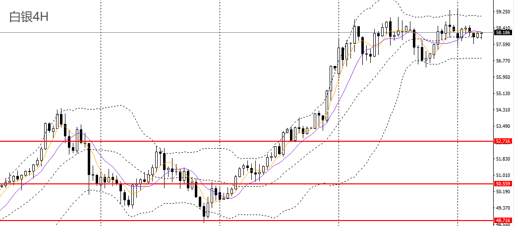 白银逼平前高,仍徘徊于5日均线附近,日线RSI位于高位,4小时仍处于56.60-59区间震荡走势,上方继续关注59.20一线阻力,如无法升破,多单可离场。