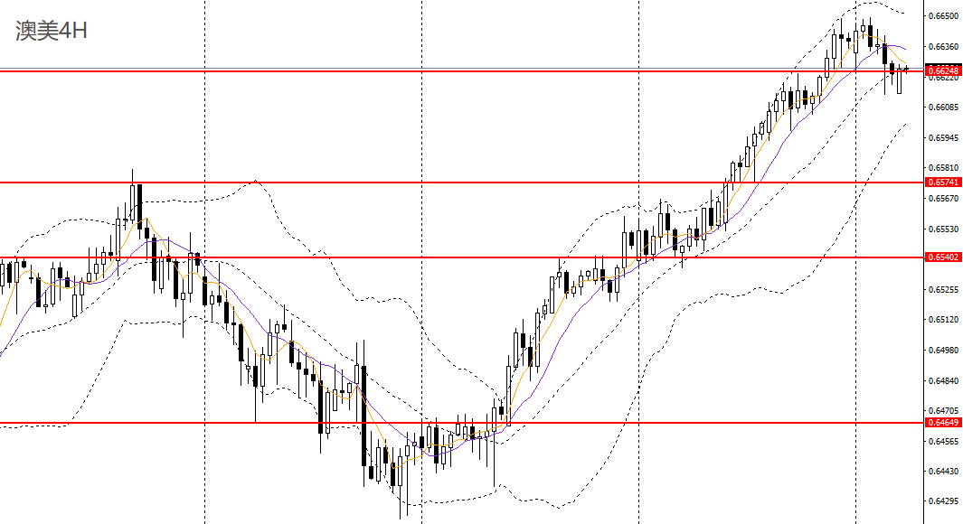 澳美日线呈平头顶部,日线RSI仍位于高位,4小时于0.6650附近遇阻回落,多头动能减弱,多单可考虑减仓,如于0.66关口附近再度企稳可做多。