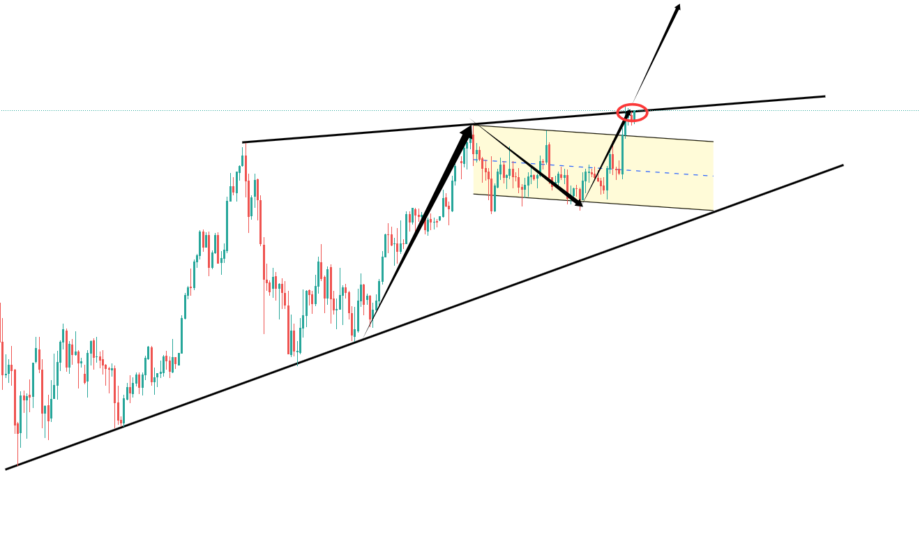 如图所示,这就是黄金目前的位置,突破是基于横盘和这两周通道的结构完成的。