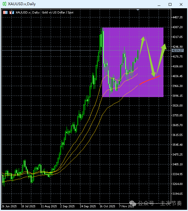 9月月线图继续收出超大的阳线,充分表现出上涨动能的强劲,整体上涨趋势保持得非常完好,思路上只能以多头思路对待,稍微一个上冲就会对4000进行测试。同时要看到,现在价格已经和均线之间有了非常大的距离,在当前这种极端上涨爆发后,随时也面临极端回调的风险。Update: 2025-11-2