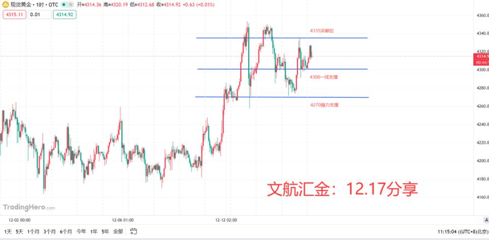 周三(12月17日)亚市早盘,现货黄金窄幅震荡,目前交投于4320美元/盎司附近。