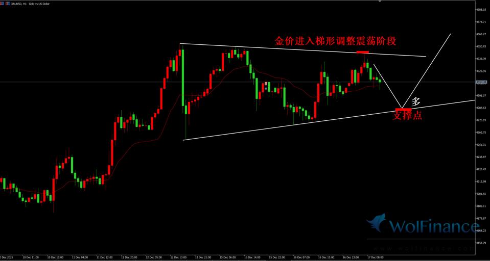 周三(12月17日)美盘前金价持续回落小幅下跌震荡,基本面推动金价上行的核心因素主要来自美国劳动力市场数据和美联储政策预期。最新数据显示,美国11月非农就业增加64,000人,略高于市场预期的50,000,而10月数据被下修至-105,000。失业率上升至4.6%,较前值4.4%有所提高,平均小时工资环比增长0.1%,显示工资增速放缓。总体来看,美国劳动力市场仍保持韧性,但增长速度减缓,这增强了市场对美联储在2026年可能进一步降息的预期,从而为黄金提供支撑。美联储的货币政策一直是黄金价格的核心驱动因素。上周,联邦公开市场委员会宣布降息25个基点,将基准利率调整至3.50%-3.75%区间,主席鲍威尔的讲话被市场解读为比预期更鸽派。他特别提到劳动力市场存在“显著下行风险”,并引用初步基准修订显示过去12个月就业新增比报告少91.1万个的估计。这次降息后,官员们暗示近期借贷成本不太可能进一步下降,但市场并不完全买账。
