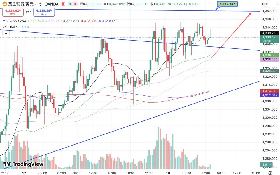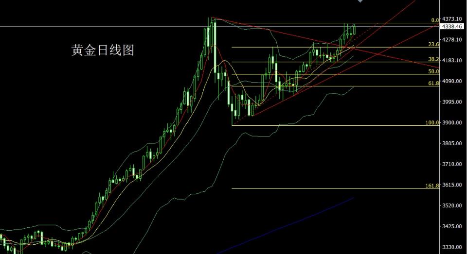 金价周三再次经历了上蹦下跳式的宽幅震荡,但是金价依旧不改探底回升的主流趋势,上方依旧是面临短期4350压制,但是调整结束此位置也是随时都能突破的,目前所有指标均线都是向上发散,多头似乎有一股神秘力量在推送,如果金价突破短期4350这里压制,我们一定要将目光看向前期历史新高4380-4385这里,前期在这里形成过双顶压制大幅回落调整过,如果再次触及此历史高位,那么就要担心金价是否再次遭遇滑铁卢——三顶压制能否形成?这也是一种行情出现的可能性。但是操作上我们还是要坚持回踩调整再多的原则进行。