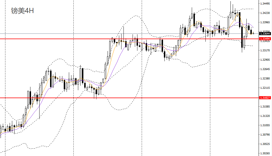 镑美昨日阴跌,刺破10日均线,4小时一度下破1.3340附近支撑,短线趋于震荡,决议前可保持观望,如于1.33关口附近企稳可进多。