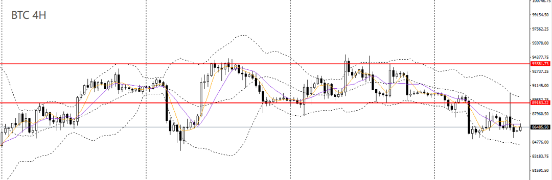 比特币冲高回落,承压于10日均线,日线RSI位于50之下,4小时再度于88000-90000一带遇阻,如继续承压于下方,短线仍以看空为主。