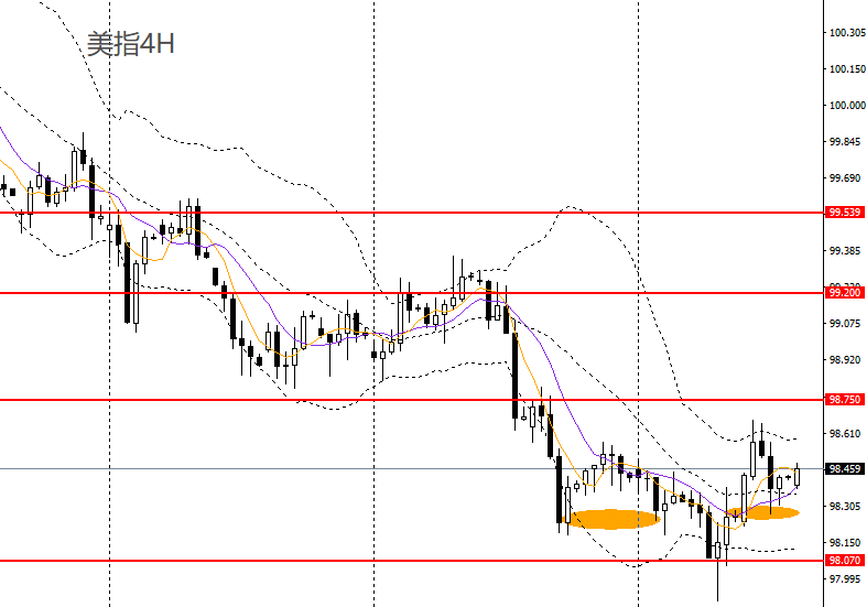 美元指数收倒锤阳线,日线RSI小幅回升,4小时呈头肩底,触及98.60-98.70压力带,如维稳于98.20上方,短线有望升破98.70附近压力。