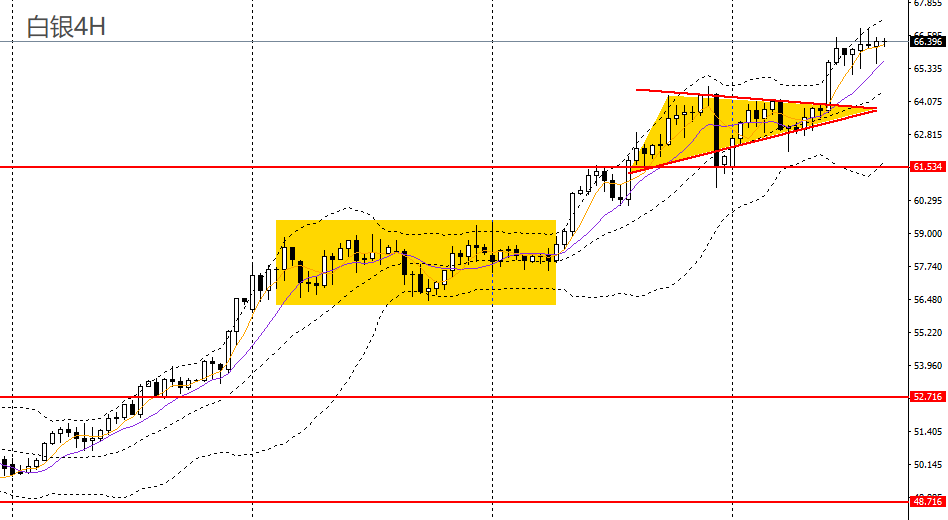 白银强势上攻,继续破高,日线RSI位于超买区附近,4小时守住65关口支撑,短线走势仍强劲,65.50上方可维持低多思路。