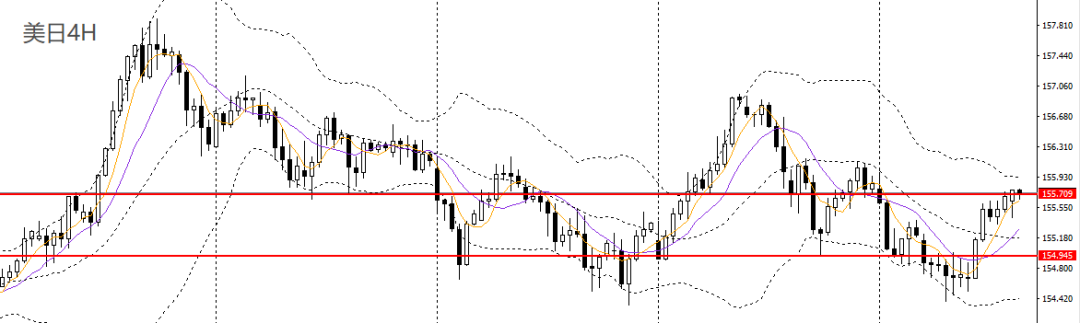 美日昨日收看涨吞没阳柱,日线呈双底,日线RSI位于50附近,4小时上探155.70一线阻力,短线趋势转多,155.30附近企稳可继续进多。