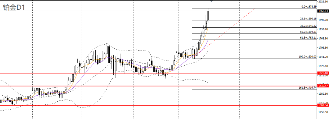 铂金继续拉涨,仍立于日线布林上轨上方,日线RSI到达超买区,4小时呈空中加油,且站稳1900关口支撑,多单可继续持有,后市仍有望上探2000大关。