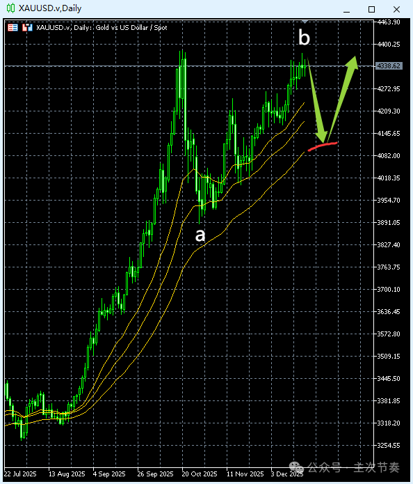 日线图吞没形态之后回调顺利发生,这是在中期涨势不变的情况下,一次阶段性调整。整个回调依然还保持在图中均线系统上方,所以大方向没有变,接下来就是看回调节奏的演变,一般初期都按照最常见的abc之字型结构考虑,再根据实际走势调整。Update: 2025-12-21