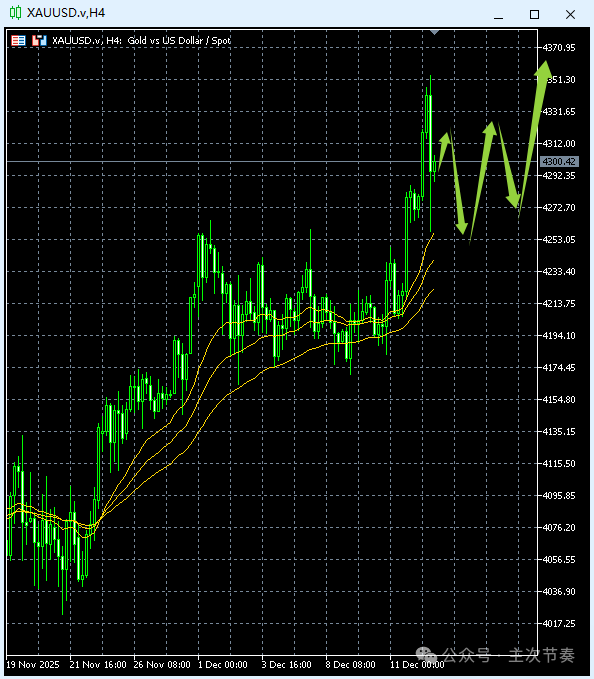 Inception: 2025-12-21上周黄金冲高回落,虽然一度有局部的向上突破,但仍然受到历史高点阻力的压制,这是对短期延续上涨不利的信号。同时4小时图均线系统依然是多头排列,表明多方依然是阶段性整体占优。在这个上方阻力较重,同时下方均线支撑也较强的阶段,行情很可能需要更长时间的震荡来积蓄动能。这是对本周行情继续震荡的判断基调。注意本周四开始是西方圣诞节假期,按照历年的规律,此时行情波动很可能非常清淡(偶尔出现突发性的极端走势),并一直延续到新年之后。预计行情恢复正常波动要等到1月5日周一。使用说明: