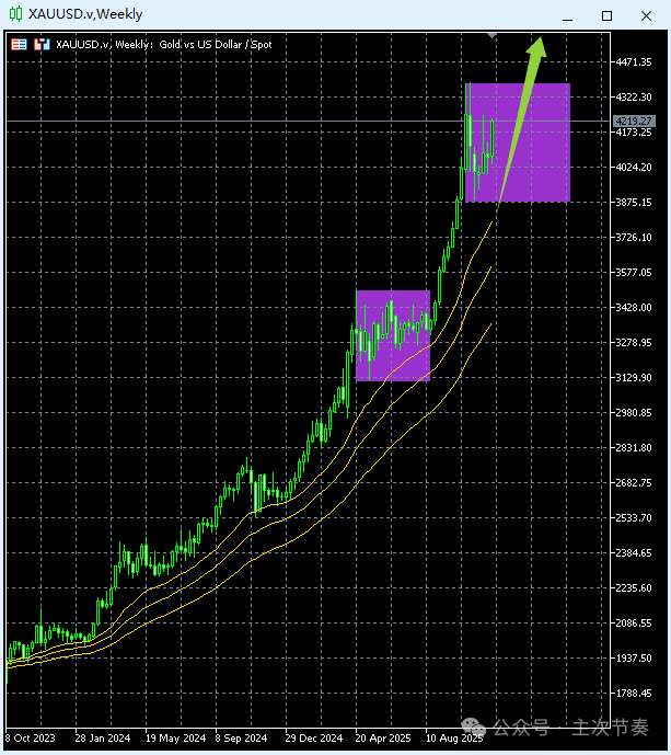 9月月线图继续收出超大的阳线,充分表现出上涨动能的强劲,整体上涨趋势保持得非常完好,思路上只能以多头思路对待,稍微一个上冲就会对4000进行测试。同时要看到,现在价格已经和均线之间有了非常大的距离,在当前这种极端上涨爆发后,随时也面临极端回调的风险。Update: 2025-11-2
